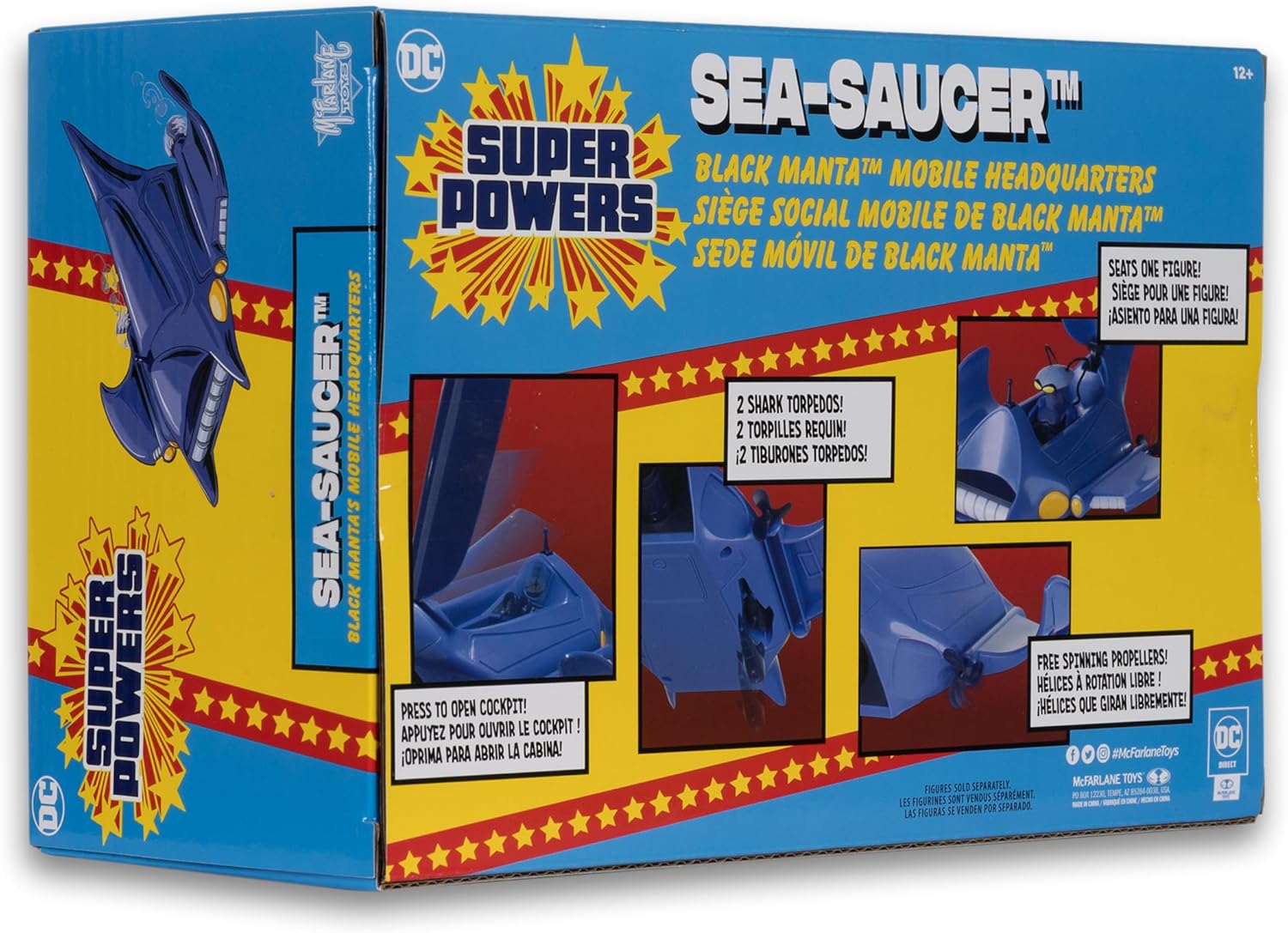 Black Manta pilots his fearsome Sea-Saucer to terrorize Aquaman and the Super Powers team. Whether by sea or air, no one is safe from the threat of Black Manta’s shark torpedos!