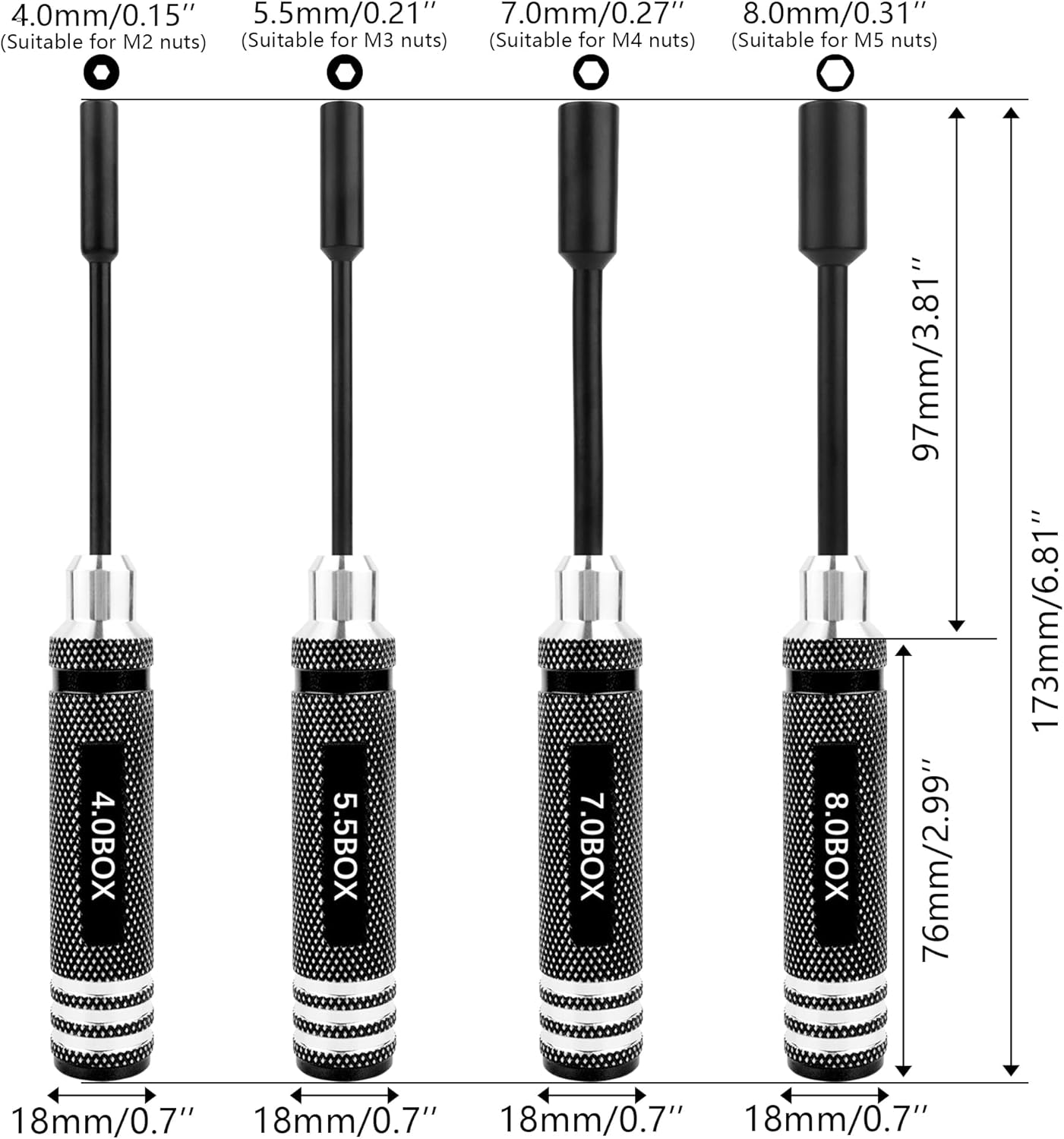 RC Hex Nut Driver Set Repair Tool Kit 4.0/5.5/7.0/8.0mm Hexagonal Head Nut Socket Wrench Screwdrivers for Hobby RC Quadcopter Helicopter FPV Drone Car Airplane(Black)
