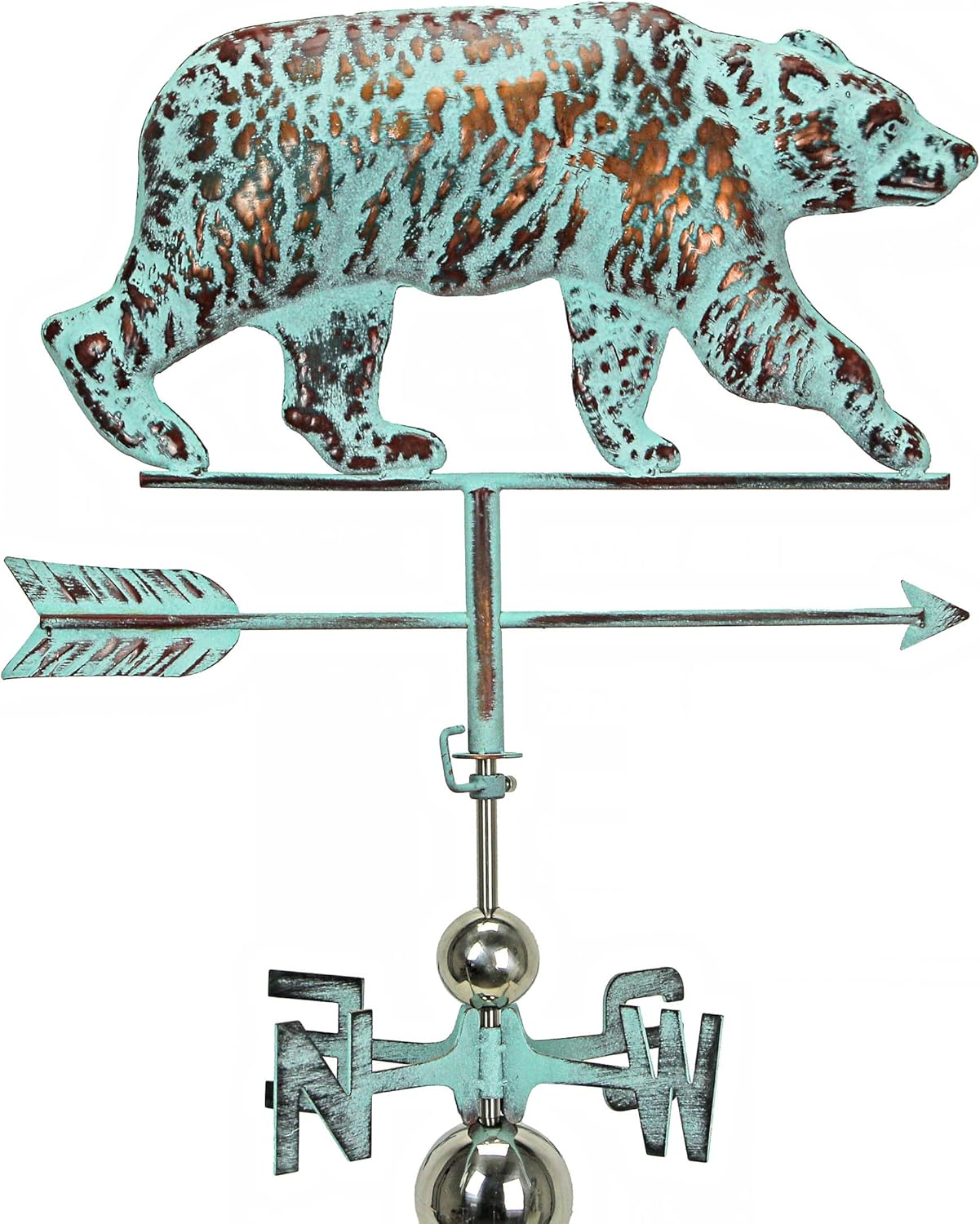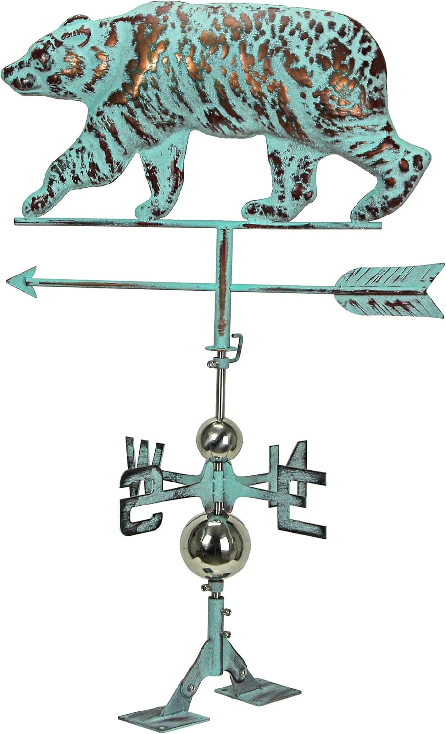 Add some rustic charm and keep an eye on the wind with this majestic bear-adorned roof-mounted weather vane. Creatively crafted from metal and copper for years of maintenance-free use, the aged copper and verdigris patina finish gives it a timeless look that is sure to complement a variety of home decor styles. Measuring 21 inches long, 13.5 inches wide, and 33 inches high with the included roof mounting anchor (hardware for mounting not included). It is easy to assemble for a fun and functional addition to your home. Makes a great gift for yourself or friends and family.